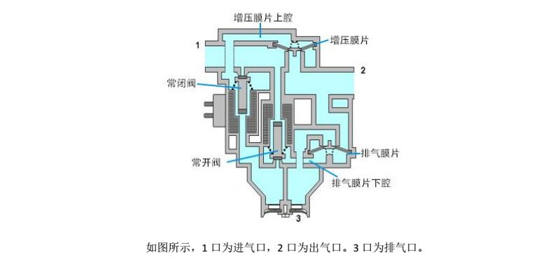 增壓時,常閉閥及常開閥均不通電,氣源直接從 1 口進入閥體,推開增壓膜片,從2口進入制動氣室。