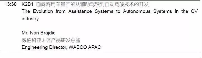 2019年4月17日,威伯科將以金牌贊助商的身份參加在國家會展中心(上海)舉辦的第五屆國際汽車關鍵技術論壇。威伯科亞太產品研發總監IvanBrajdic先生將作為演講嘉賓在智能汽車技術分論壇中發表題為“面向商用車量產的從輔助駕駛到自動駕駛技術的開發”的演講。
